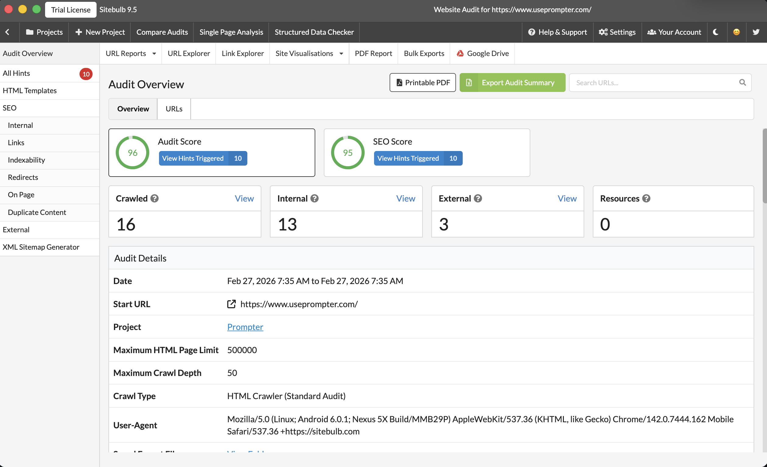 Sitebulb is known for beautiful visualizations and guided auditing — and it does that well. PageBrain matches that clarity and extends it with AI agents that understand your data, workflow-driven bulk fixes, GEO analysis for AI search, and a full audit builder that turns crawl findings into polished deliverables.